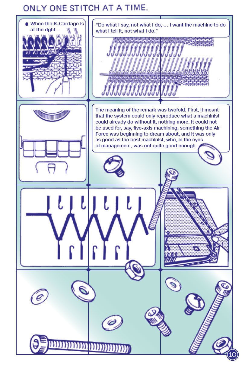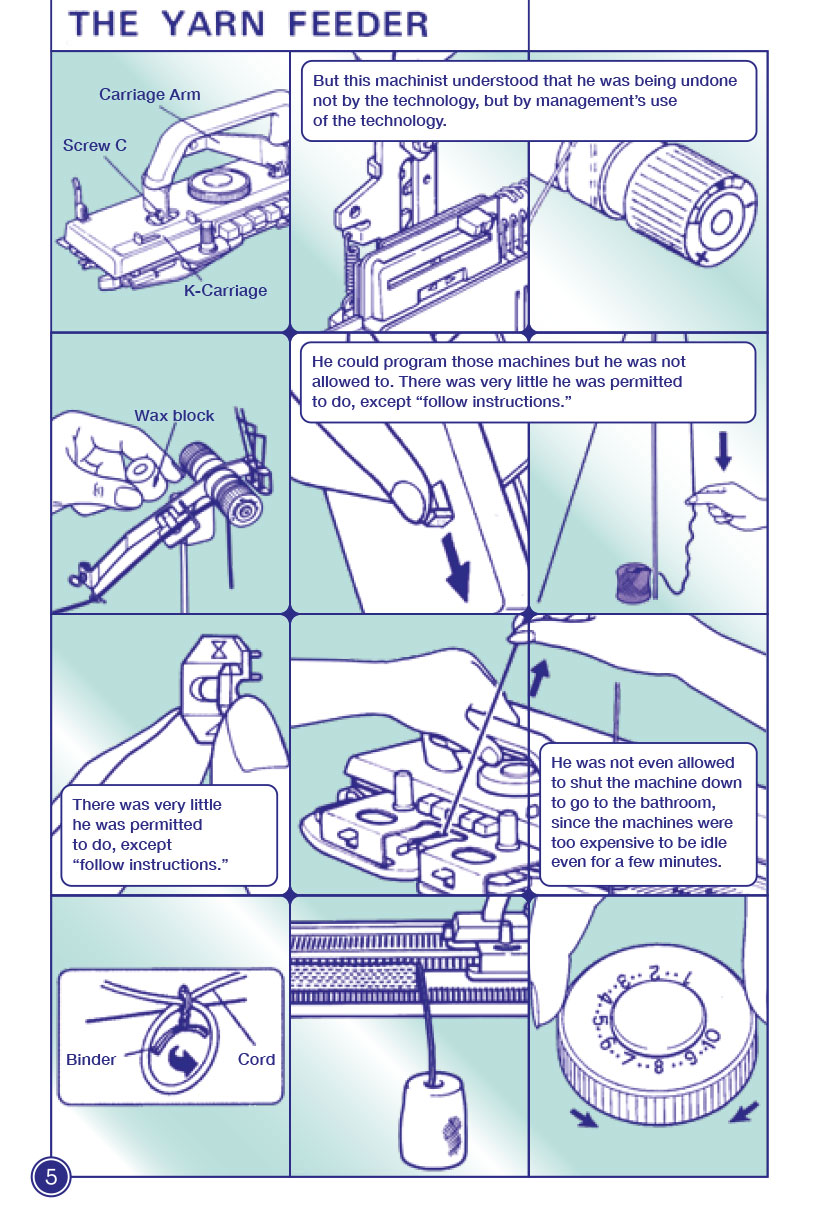 Le texte original du mode d’emploi a été remplacé par des extraits de Les forces de production, de David F. Noble (1984), une réflexion sur les innovations techniques en matière d’automatisation et de mécanisation industrielles. Ces innovations ont pour première fonction d’augmenter le rendement de l’investissement, en diminuant les variables de coût que sont les travailleurs et leur formation. Quand ils sont encore nécessaires, ils peuvent désormais être des idiots.